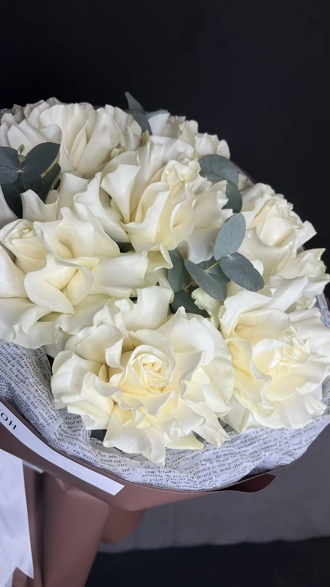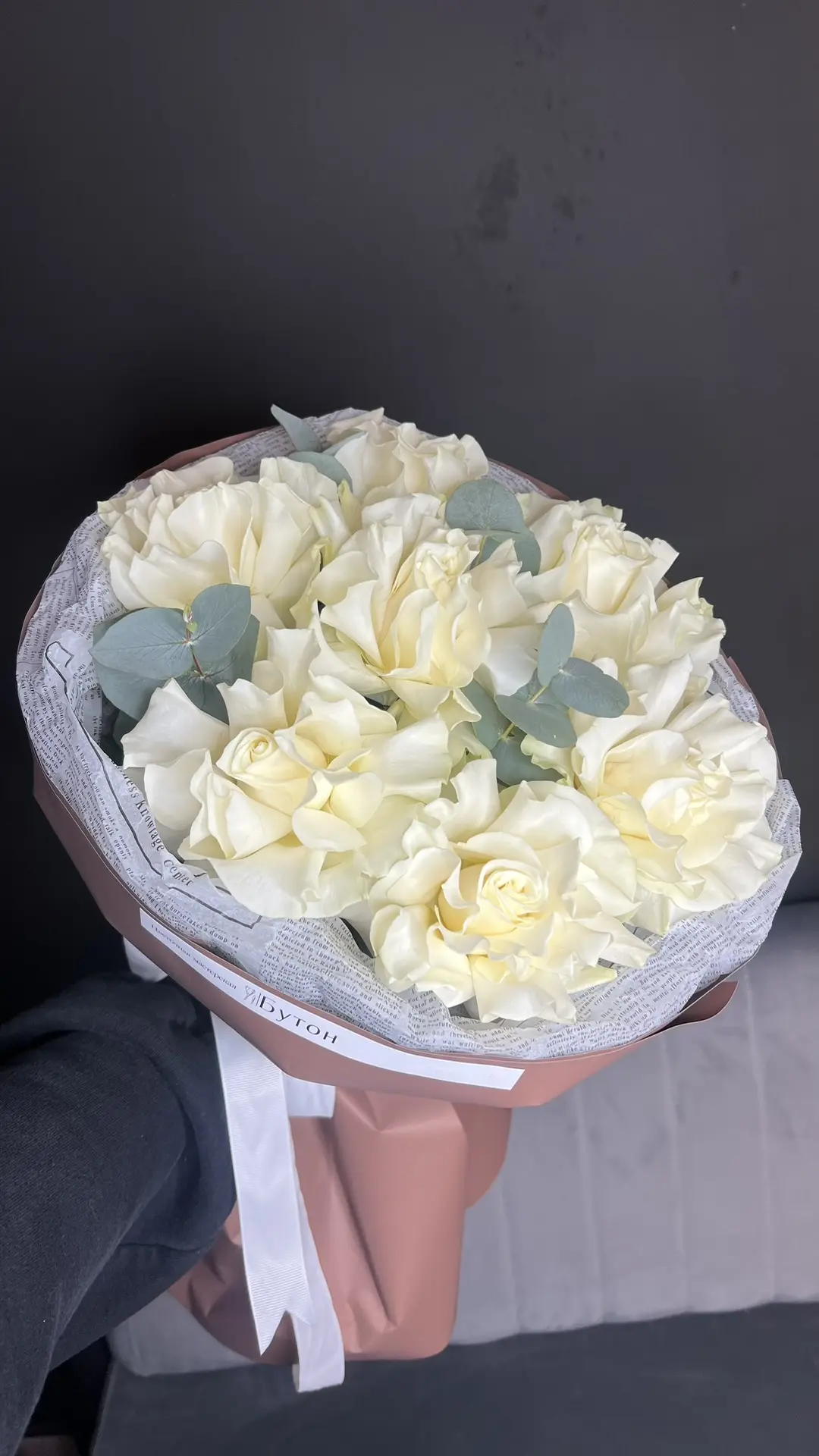 Моно букет с французскими розами и эвкалиптом
